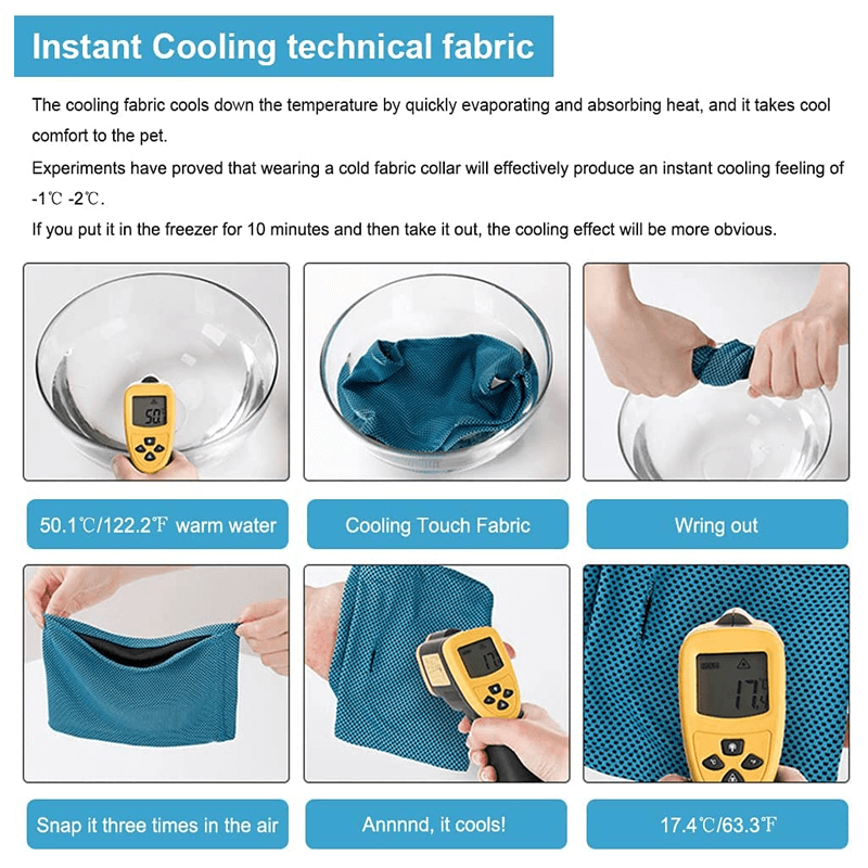 ✅ Kemikaaliton ja uudelleenkäytettävä jäähdytysratkaisu - Toisin kuin muut markkinoilla olevat jäähdytystuotteet, kaulapantamme ei vaadi kemikaaleja. Se käyttää ainutlaatuista jäähdytysmekanismia, joka aktivoituu vedellä, mikä tarjoaa turvallisen ja ympäristöystävällisen jäähdytysratkaisun lemmikillesi.