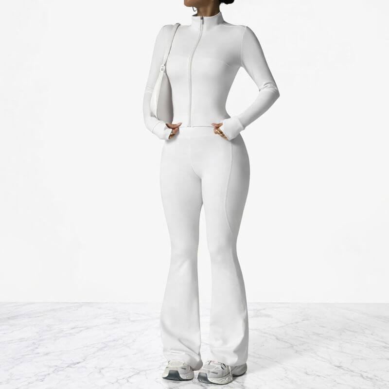 AeroFlare – Nopeasti kuivuva naisten treenisetti, jossa on kapea takki ja levenevät trikoot joogaan, treenaamiseen ja jokapäiväiseen käyttöön
