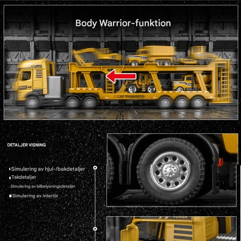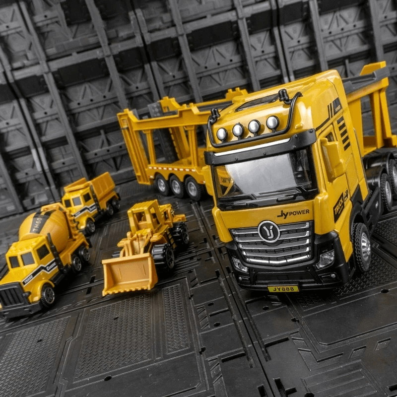 Sisältää | Doubledeck trailer -kuorma-auto, Bulldozer, Kippiauto, Betonimylly, Telajyrä |